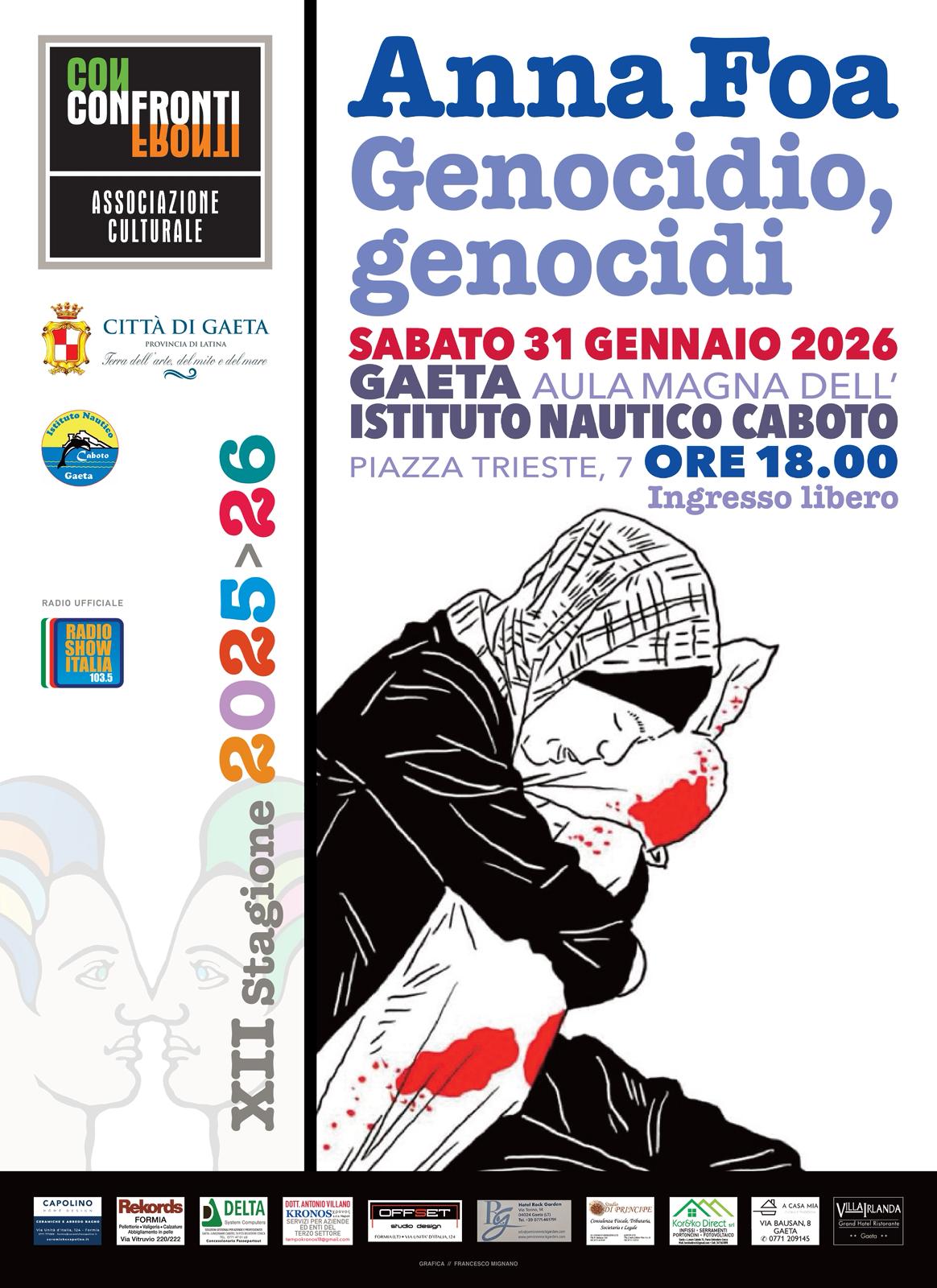 Confronti con Anna Foa – La XII° stagione di Confronti riparte sabato 31 gennaio, alle ore 18:00 presso l’Aula Magna dell’Istituto Nautico Caboto, con la professoressa Anna Foa sul tema “Genocidio, genocidi”. Anna Foa con la sua proverbiale competenza e chiarezza affronterà un tema attualmente molto discusso e divisivo: il termine genocidio che è in questo momento uno dei termini ovunque più discussi riflettendo sulle terribili vicissitudini di Gaza dopo che Israele è stata appunto accusata di genocidio davanti alla Corte Internazionale di Giustizia dell’ONU.