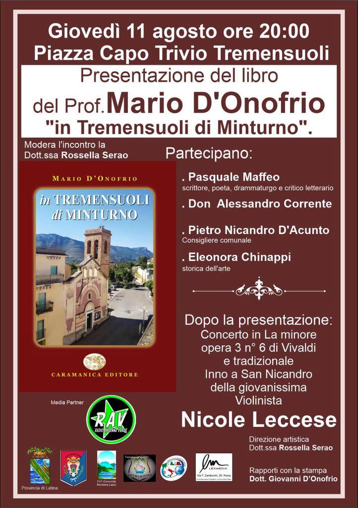 La sera dell’11 agosto alle ore 20:00, in Piazza Capo Trivio a Tremensuoli di Minturno (Latina), si svolgerà la presentazione del libro di Mario D’Onofrio “in Tremensuoli di Minturno“, Caramanica Editore. Sarà presente l’autore Mario D’Onofrio, già professore ordinario di Storia dell’arte medievale nella Facoltà di Lettere dell’Università degli Studi La Sapienza di Roma. D’Onofrio è autore, tra l’altro, de “La cattedrale di Caserta Vecchia”, “Roma e Aquisgrana”. Parteciperà al tavolo dei lavori il poeta, drammaturgo, scrittore e critico letterario Pasquale Maffeo, autore di romanzi e di raccolte di racconti, oltre ai volumi di critica letteraria. Tra le sue opere maggiori, “La luna nel paniere”, “L’angelo bizantino” (candidato al premio Strega) e “Poeti cristiani del Novecento, ricognizione e testi”.