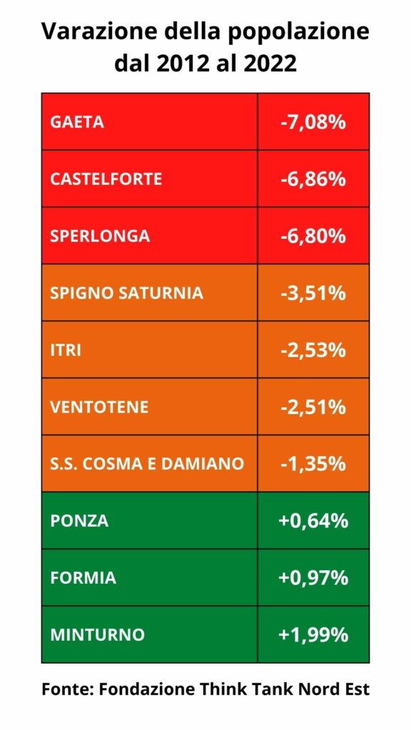 Inverno demografico: i numeri del Golfo di Gaeta – Il calo della popolazione sta in qualche modo svuotando interi territori. La flessione del numero degli abitanti, si legge nel comunicato della Fondazione Think Tank Nord est “è peraltro destinata ad intensificarsi nei prossimi anni, mettendo quindi a rischio la sostenibilità dei ervizi legati all’istruzione e al sociale, ma anche alla cultura e allo sport.” Per fare un esempio, nella piccola Ventotene da anni è a rischio la presenza di una scuola elementare causa calo demografico e in altri comuni è in discussione il finanziamento del trasporto pubblico locale. Lo spopolamento a sua volta “causa la scomparsa delle attività economiche, generando ulteriore isolamento e declino economico, in una spirale di effetti negativi difficile da invertire.” Il futuro delle città passa da scelte cruciali che dovranno affrontare le amministrazioni locali riprogrammando i propri interventi sui servizi essenziali facendo affidamento su un bacino demografico minimo.