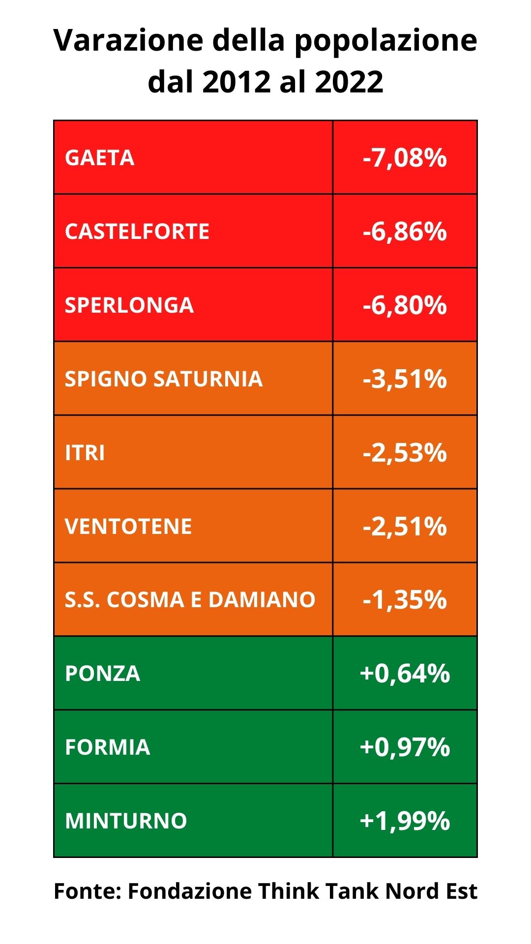 Inverno demografico: i numeri del Golfo di Gaeta – Una flessione generale della popolazione è quello che emerge da un recente studio sul nostro Paese. Una calo demografico diffuso ed omogeno su tutto il territorio nazionale che non fa sconti nemmeno nel Golfo di Gaeta con i dati che raccontano meglio di altro una tendenza in alcuni casi peraltro già avvertita dal dibattito pubblico. La popolazione italiana sta invecchiando e i piccoli territori, in modo asimettrico, stanno perdendo linfa vitale e risorse a discapito dei centri medio grandi. Questo è quello che emerge dai dati raccolti dalla Fondazione Think Tank Nord Est e presentati lo scorso novembre evidenziano come già detto un calo generale della popolazione. In media tutti gli enti locali mostrano trend negativi, ma con differenze significative a seconda delle dimensioni. Sono i municipi più piccoli, ad evidenziare una forte diminuzione dei residenti. Il trend, con un dato nazionale del -19% su base decennale e in generale peggiore man mano che diminuisce la dimensione abitativa, è confermato dagli indicatori demografici calcolati su tutti i 7.904 comuni della penisola. Numeri però che ci raccontano un’eccezione degna di nota nel Golfo che va in controtendenza rispetto alle performance nazionali. Come si può vedere dalla tabella riepilogativa, il fanalino di coda è rappresentata dalla Città di Gaeta. Nonostante sia una comune con popolazione superiore ai 15mila abitanti negli ultimi anni ha visto un trend di variazione demografico del -7,08%. Una trasformazione che ha colpito anche Sperlonga con il suo -6,80%. Due realtà in cui i residenti stanno lasciando via via spazio ai turisti per molteplici ragioni legate in buona sostanza anche al mercato immobiliare. Non stupisce, invece, il dato di comuni come Spigno Saturnia (-3,51%), Itri (-2,53%), Ventotene (-2,51%) e SS. Cosma e Damiano (-1.35%) che confermano il trend nazionale. Si mantiene stabile Ponza (+0,64%) e tra le città più grandi Formia (+0,97%) e Minturno che con il suo +1,99% fa registrare la miglior performance in riva al Golfo.