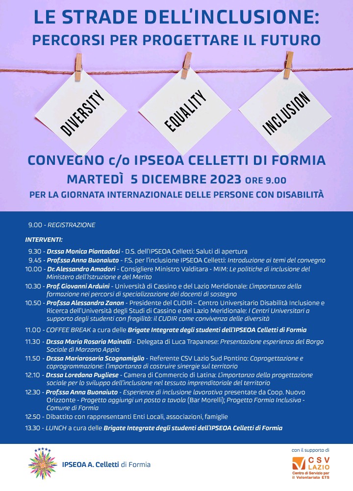 Formia – Per la Giornata Internazionale delle Persone con Disabilità l’Istituto “A.Celletti” di Formia, con il supporto del Centro di Servizio per il Volontariato ETS, ha organizzato il convegno “Le strade dell’inclusione: percorsi per progettare il futuro” che si terrà martedì 5 dicembre dalle ore 9,00 alle ore 13, 30, durante il quale prenderanno parte il professore Giovanni Arduini dell’Università di Cassino e del Lazio Meridionale, il Consigliere Ministro Valditara, il dott. Alessandro Amadori; la professoressa Alessandra Zanon, presidente del CUDIR – Centro Universitario Disabilità Inclusione e ricerca dell’università degli studi di Cassino e del Lazio Meridionale; la dott.ssa Mariarosaria Scogliamiglio referente CSV Lazio Sud Pontino; la dott.ssa Loredana Pugliese della Camera di commercio di Latina; la dott.ssa Maria Rosaria Mainelli, delegata di Luca Trapanese e la prof.ssa Anna Bonaiuto, docente dell’istituto Celletti e portavoce per l’inclusione dei disabili nel lavoro.