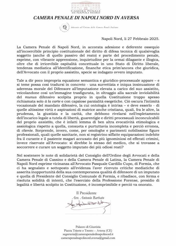 La vicinanza all’Avvocato Pasquale Cardillo Cupo espresso della Camera Penale di Napoli Nord – “Un sentito e doveroso ringraziamento agli amici della Camera Penale di Napoli Nord, tra le più autorevoli d’Italia, per la loro vicinanza contro i continui attacchi mediatici alla mia persona per l’esercizio della Professione di Avvocato da parte di Luca Magliozzi e alcuni consiglieri del PD di Formia.