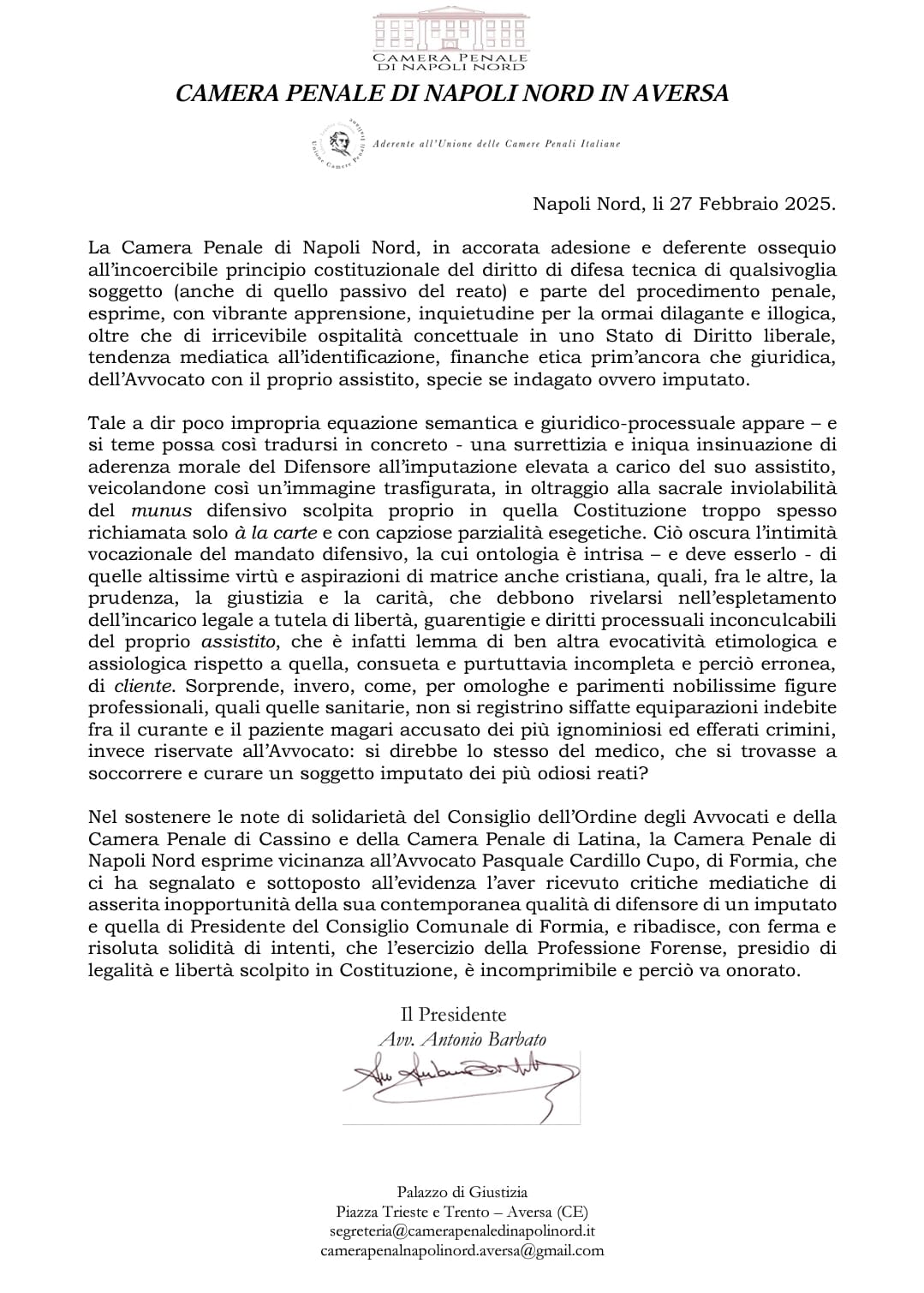 Condivido pienamente quanto affermato dai colleghi di Aversa e dal loro Presidente Antonio Barbato, gigante dell’Avvocatura, quando definisce questi atteggiamenti di squallida speculazione politica come “Oltraggio Sacrale alla nostra Costituzione”. Non arretreremo mai. Grazie.” Queste le parole dell’Avvocato Pasquale Cardillo Cupo, di seguito la lettera: