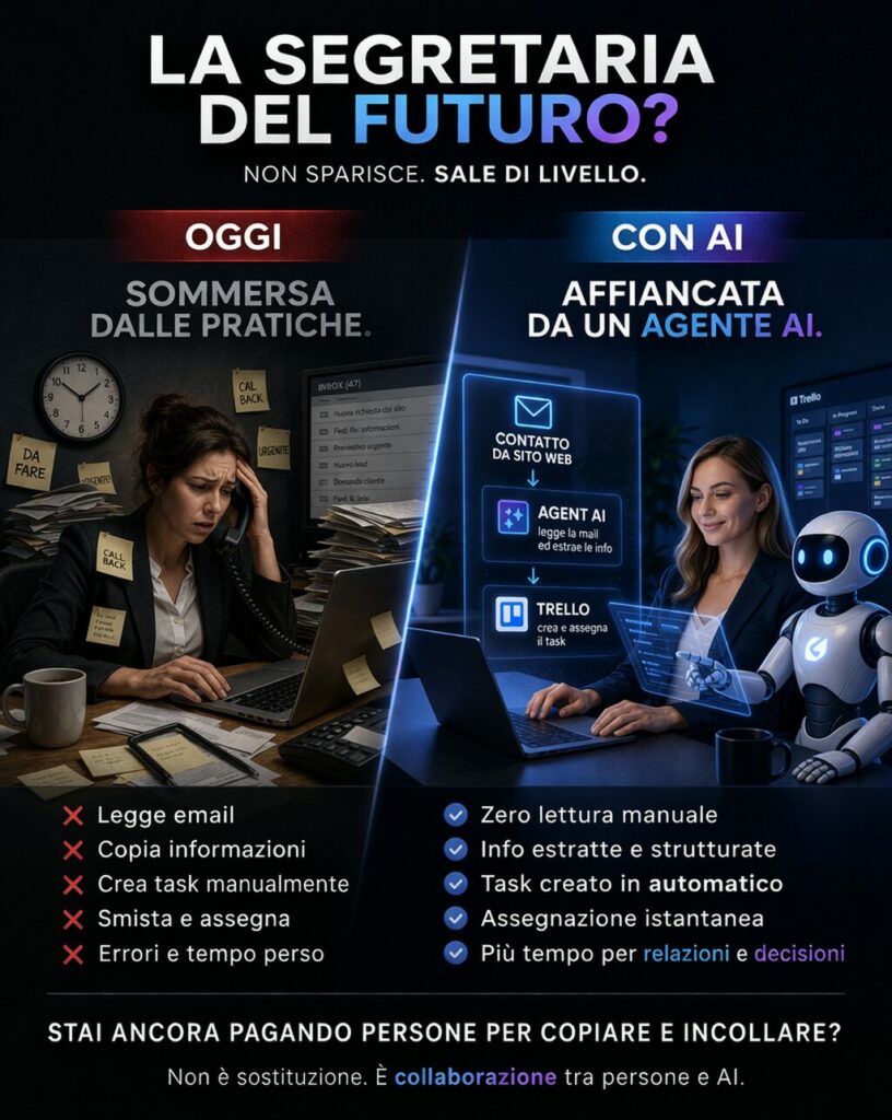 Negli ultimi anni il dibattito sull’intelligenza artificiale si è spesso concentrato su una domanda tanto semplice quanto fuorviante: le macchine sostituiranno le persone? In particolare, ruoli operativi come quello della segretaria o dell’assistente amministrativo sono stati indicati tra i più esposti al rischio automazione. Ma questa visione, per quanto diffusa, rischia di non cogliere la trasformazione reale in atto nelle aziende.