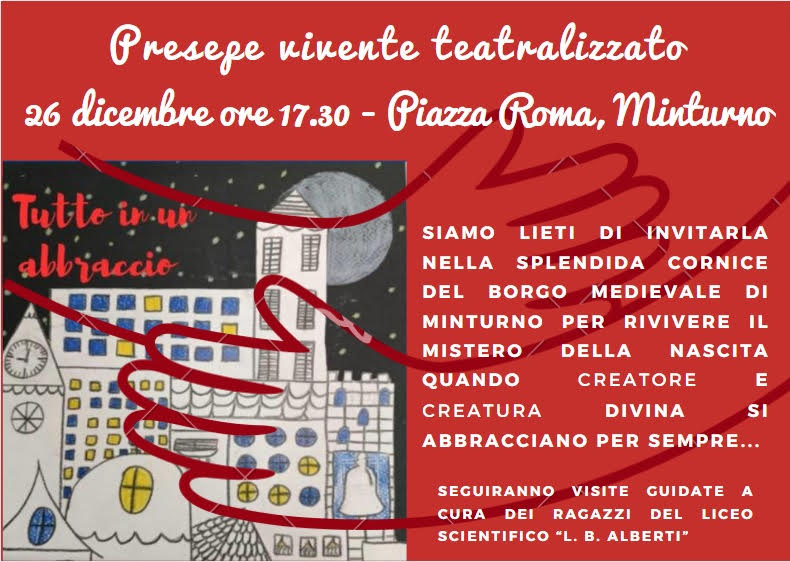Il docente di religione Emilia Alicandro, infaticabile nei suoi progetti, in organico presso il Liceo Scientifico Statale Leon Battista Alberti di Marina di Minturno propone per oggi festività del Protomartire Stefano un Presepe Vivente Teatralizzato con inizio alle ore 17.30 e raduno in Piazza Roma a Minturno capoluogo. Grazie alla disponibilità del dirigente scolastico Amato Polidoro seguiranno visite guidate a cura dei ragazzi del Liceo Scientifico Leon Battista Alberto. Spiega Emilia Alicandro: “Una splendida cornice del borgo medievale di Minturno per rivivere il mistero della nascita quando creatore e creatura divina si abbracciano per sempre”.