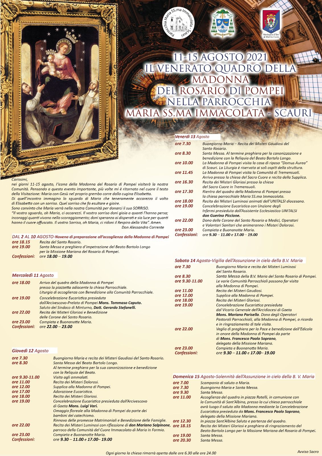 La Chiesa di Maria Santissima Immacolata in Scauri con il parroco don Alessandro Corrente sta celebrando la Madonna di Pompei presente con il suo venerato quadro da oggi a domenica 11 agosto.