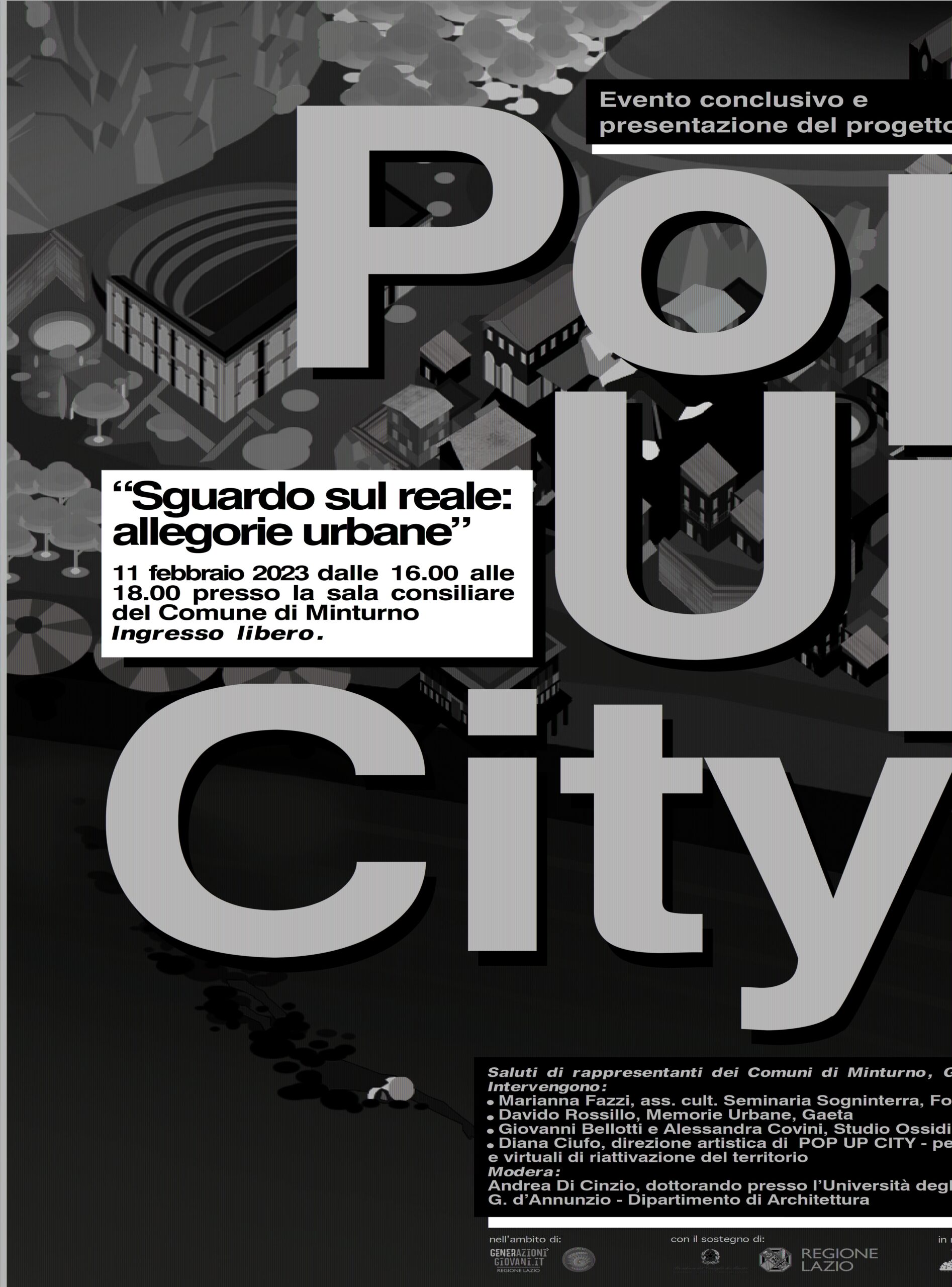 Si terrà il prossimo 11 febbraio 2023, dalle 16 alle 18, presso la sala consiliare del Comune di Minturno, l’evento “Sguardo sul reale: Allegorie urbane”. L’incontro rappresenta la conclusione di un anno di attività sul territorio del progetto “POP UP CITY – Percorsi reali e virtuali di riattivazione del territorio”, vincitore del bando “VitaminaG” nell’ambito del programma “GenerAzioniGiovani.it” finanziato dalle Politiche Giovanili della Regione Lazio con il sostegno del Dipartimento per la Gioventù. Durante l’incontro si intende riflettere su come l’arte e la cultura possano instaurare dei processi virtuosi all’interno delle comunità e divenire occasioni di rigenerazione urbana. Il progetto “Pop Up City” vuole esperire il territorio utilizzando la tecnologia digitale della realtà aumentata applicata ai beni culturali. Diventa cosi possibile raccontare storie che affondano le radici nella cultura locale e che si fanno portavoce di un immaginario collettivo. Si tratta di narrazioni, leggende, storie vere, false o verosimili, raccolte sul territorio e restituite attraverso un percorso autoriale di rielaborazione artistica che si avvale di tecniche diverse: Pittura digitale, 3d art, cinema, foto, audio. “POP-UP CITY” nasce sia come una sfida che come un esercizio di immaginazione con l’intento di aprire delle finestre inaspettate all’interno della città, delle allegorie urbane virtuali ma allo stesso tempo reali. All’evento ci saranno rappresentanti dei Comuni di Minturno, Gaeta e Formia. Interverranno: Marianna Fazzi dell’Associazione Culturale Seminaria Sogninterra di Formia, Davide Rossillo di Memorie Urbane Gaeta, Giovanni Bellotti e Alessandra Covini di Studio Ossidiana Rotterdam e Diana Ciufo, direzione artistica di POP UP CITY – Percorsi reali e virtuali di riattivazione del territorio. Modera Andrea Di Cinzio, dottorando presso l’Università degli Studi D’Annunzio – Dipartimento di Architettura. Ingresso libero.