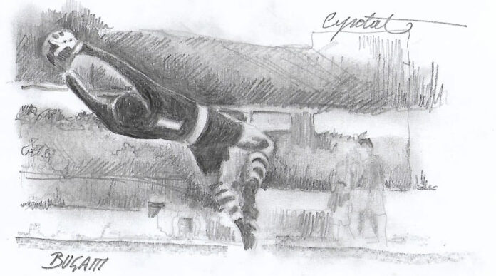 L’anfiteatro lusitano era gremito di settantamila spettatori, entusiasti di vedere la loro squadra risorgere dopo le sconfitte subite dalla Francia e dall’Irlanda del Nord. Fu un disastro, una disfatta dovuta a mancanza di grinta e organizzazione di gioco. Si salvarono solo Bernasconi e Bugatti, quest’ultimo comunque insicuro su un’uscita di porta che favoriva la seconda rete dei portoghesi. Erano ventinove anni che il Portogallo non batteva l’Italia e mai la Seleção Portuguesa aveva vinto una gara per le qualificazioni alla Coppa del Mondo. Ci riuscì contro gli azzurri rappresentati da Boniperti, Fontana, Pesaola e tanti altri e Ottavio Bugatti. Quel Bugatti che tanto ricorderemo per quella sua voglia di godersi la vita e di come si presentò a Napoli su una spider color amaranto con qualche bottiglia di cognac a bordo: un marinaio del calcio.” Articolo di Pierluigi Larotonda, disegno di Stefano Cipolat