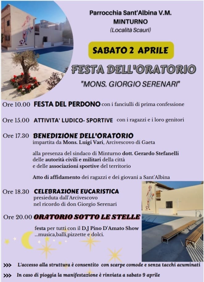 Festa grande sabato 2 aprile per l’Oratorio che si inaugura in Piazza Santa Albina- Via Marconi – Via Don Angelo Di Giorgio. In caso di maltempo l’evento sarà spostato al sabato successivo 9 aprile. Una giornata di festa sopratutto perchè il centro abitato di Scauri coinquista un suo oratorio ponte ideale tra le iniziative ecclesiali e quelle civiche.