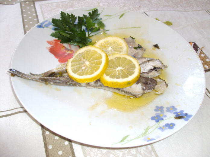 Dopo aver ‘pulito’ i merluzzi (eliminando la testa e privando le interiora) mettiamo un po’ d’acqua in una padella e accendiamo il fornello, al fine d’intiepidire l’acqua. Aggiungiamo i merluzzi cucinandoli per 3-4 minuti e successivamente aggiungiamo l’aglio, un filo d’olio, una premuta di limone ed un ciuffo di prezzemolo tagliato finemente. Facciamo cuocere per circa 10 minuti girando i merluzzi a metà cottura. Terminiamo adagiando i tre merluzzi su di un piatto piano decorando con tre fette di limone e del prezzemolo.