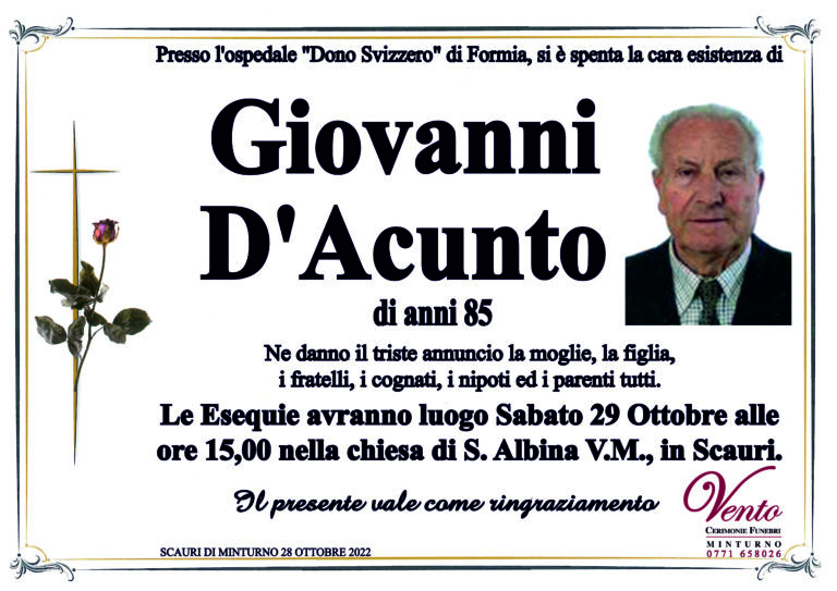 Scauri: Giovanni D’Acunto, personaggio noto e stimato, ci ha lasciati, sabato le esequie