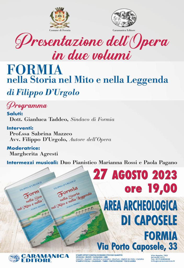 Formia: presentazione dei due volumi di Filippo D’Urgolo “Formia nella storia, nel mito e nella leggenda” Area Caposele domenica 27 agosto ore 19.00