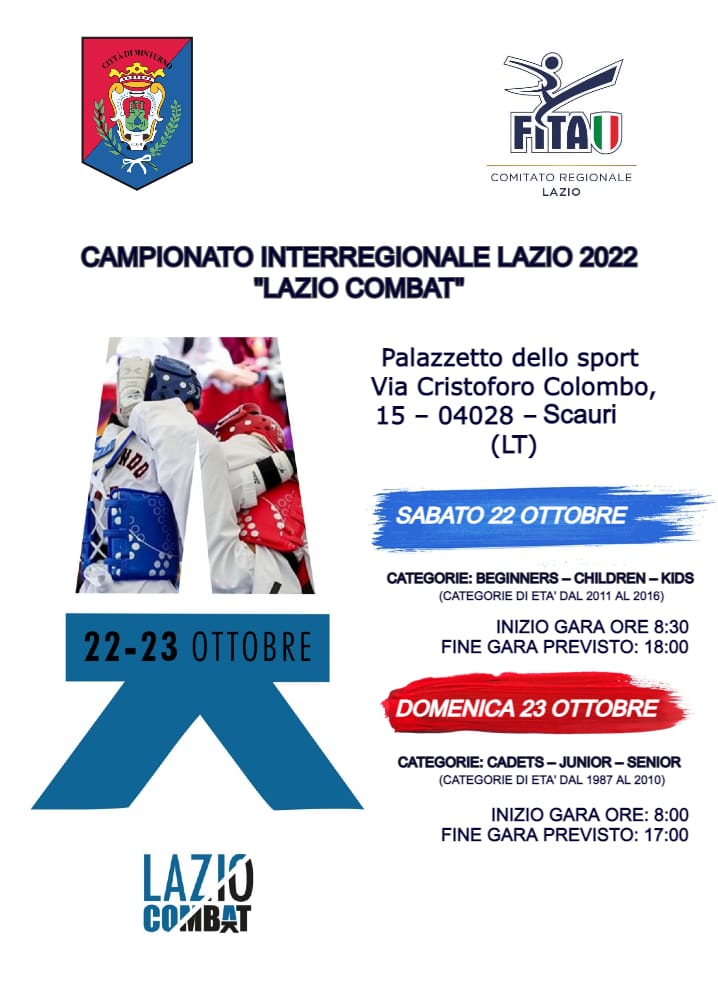 Taekwondo, “Lazio Combat” a Scauri presso il Palazzetto dello Sport sabato 22 e domenica 23 ottobre.
